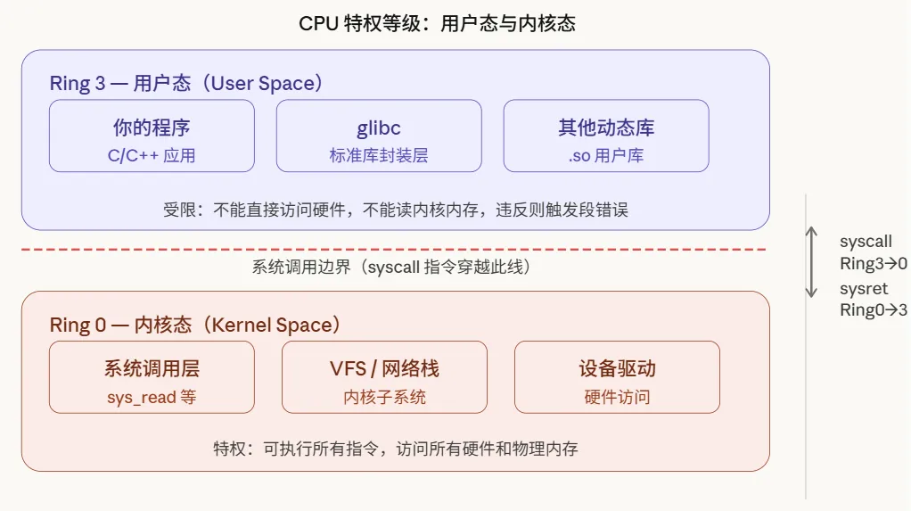 fwrite在用户态设置了缓冲区,数据积累到一定量(比如4096字节)才发起一次真正的write()系统调用,将N次调用压缩为1次。epoll模式下,每个就绪的I/O事件通常都需要独立的read()/write()系统调用来处理。而io_uring通过共享内存环形队列,允许批量提交和收割I/O请求,极大减少了系统调用次数,甚至可以实现“零系统调用”的轮询模式。epoll,一次epoll_wait可以处理大量连接事件,将系统调用频率降到极低。根本区别在于CPU特权等级不同。用户态(Ring 3)代码受限,不能直接访问硬件和内核内存;内核态(Ring 0)拥有最高权限,可以执行所有指令、访问所有硬件。两者通过系统调用(syscall指令)进行安全切换,这是操作系统稳定性的基础保障。