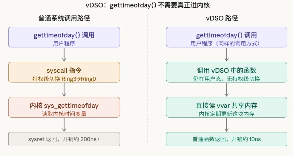 有些系统调用极其频繁,但本质上并不需要操作硬件——比如获取时间的gettimeofday(),只是读取一下系统时钟。如果每次都走完整的系统调用路径,未免太浪费了。