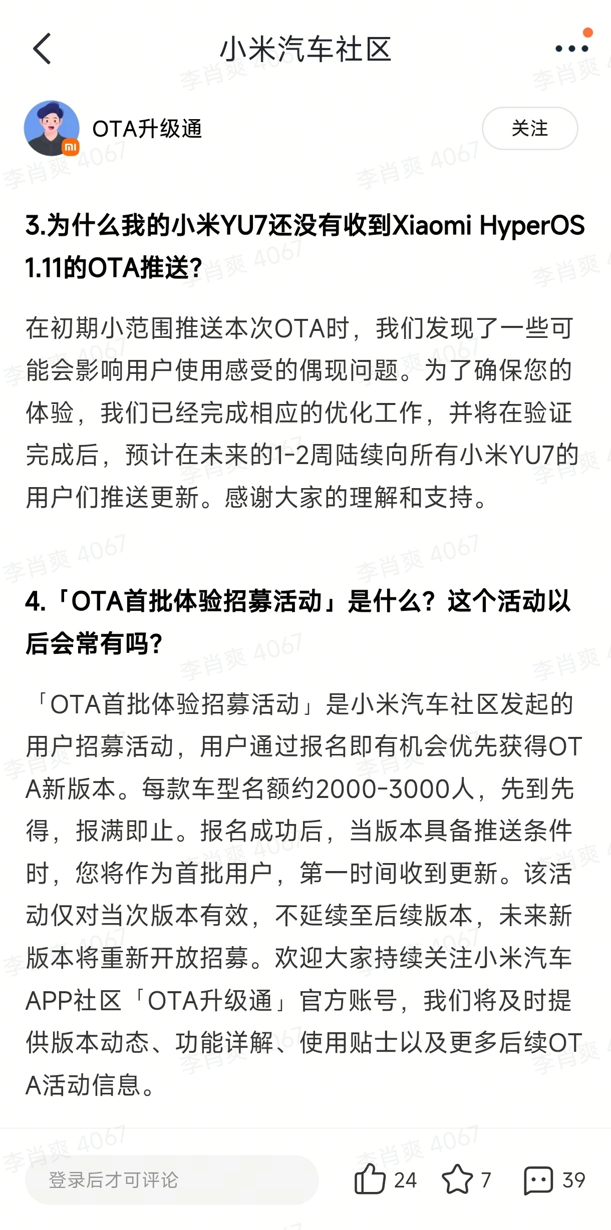 12月11日,小米汽车副总裁李肖爽通过微博回应了车主关切,确认YU7车型的OTA推送时间有所延迟。