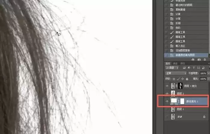 在发丝图层下方新建一个纯色填充图层(建议使用高对比色如亮绿或红色)。通过背景衬托,可以清晰检验每一根发丝的抠图精度与边缘质量。