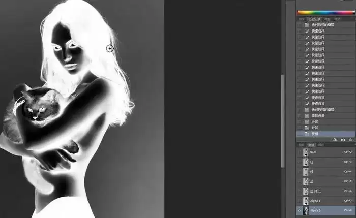 按Ctrl+I对“蓝 拷贝”通道执行反相操作。此步骤将原本深色的发丝转换为白色(选区),而背景则转换为黑色,为生成精确选区奠定基础。