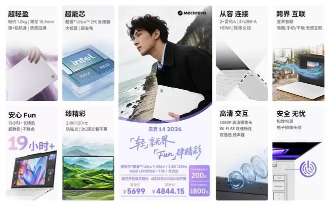 首先是定位高配的无界14 2026月光白。这款机型搭载了英特尔酷睿Ultra 7-256V处理器,屏幕规格给到了2.8K分辨率和120Hz刷新率,内存组合为16GB LPDDR5X加1TB存储。它的首发定价为5699元,但在国家补贴后,实际到手价可以做到4844.15元。
