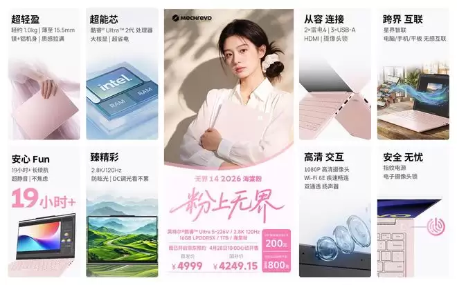 接下来是主打新配色的无界14 2026海棠粉。它在核心上采用了酷睿Ultra 5-226V处理器,但同样配备了2.8K 120Hz的高素质屏幕以及16GB+1TB的存储组合。显然,这款机型的目标用户非常明确。其首发价为4999元,国补后的价格是4249.15元。