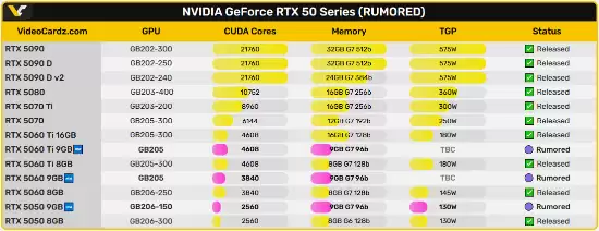 根据行业最新传闻,英伟达在其即将发布的RTX 50系列显卡上,似乎将继续沿用其标志性的市场细分策略。焦点集中在两款新的主流型号上:配备9GB显存的RTX 5060 Ti与RTX 5060。