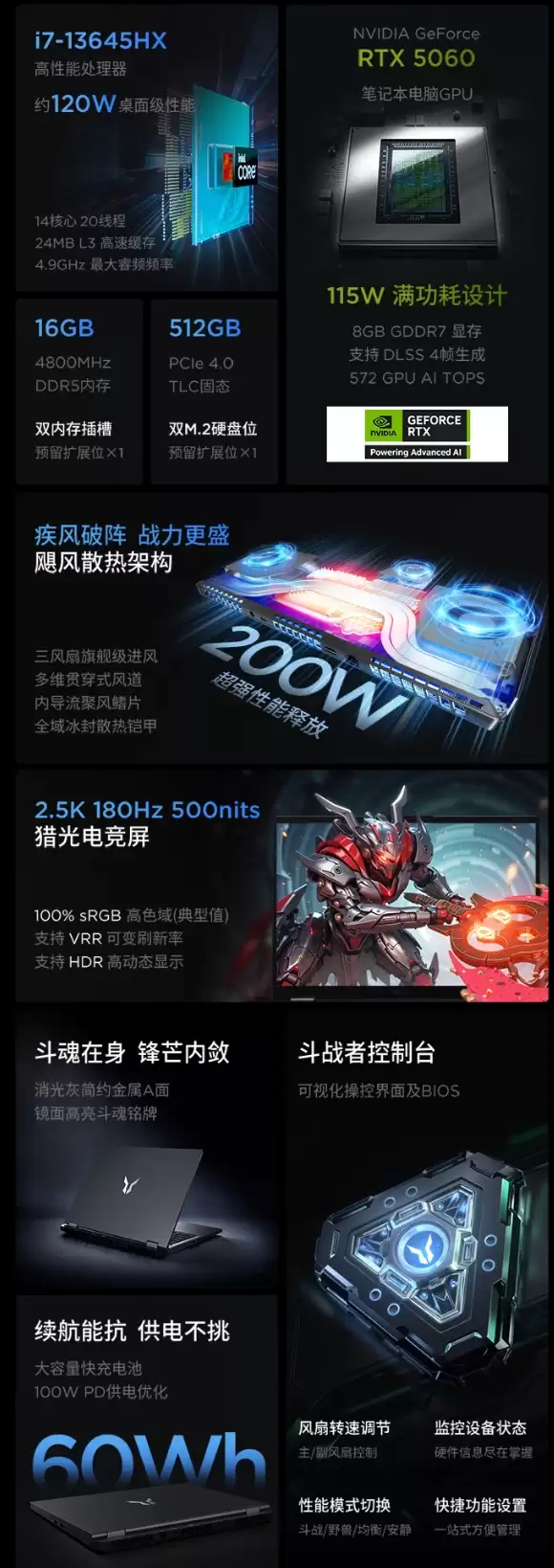 战7000延续了该系列的硬派设计基因,机身线条锐利,呈现出鲜明的机甲风格。其屏幕素质是主要亮点:采用一块16英寸2.5K(2560x1600)分辨率面板,支持180Hz高刷新率与500尼特峰值亮度,并覆盖100% sRGB色域。这一组合确保了游戏画面流畅无拖影,同时在色彩还原与明暗细节上能满足内容创作与影音娱乐的视觉需求。