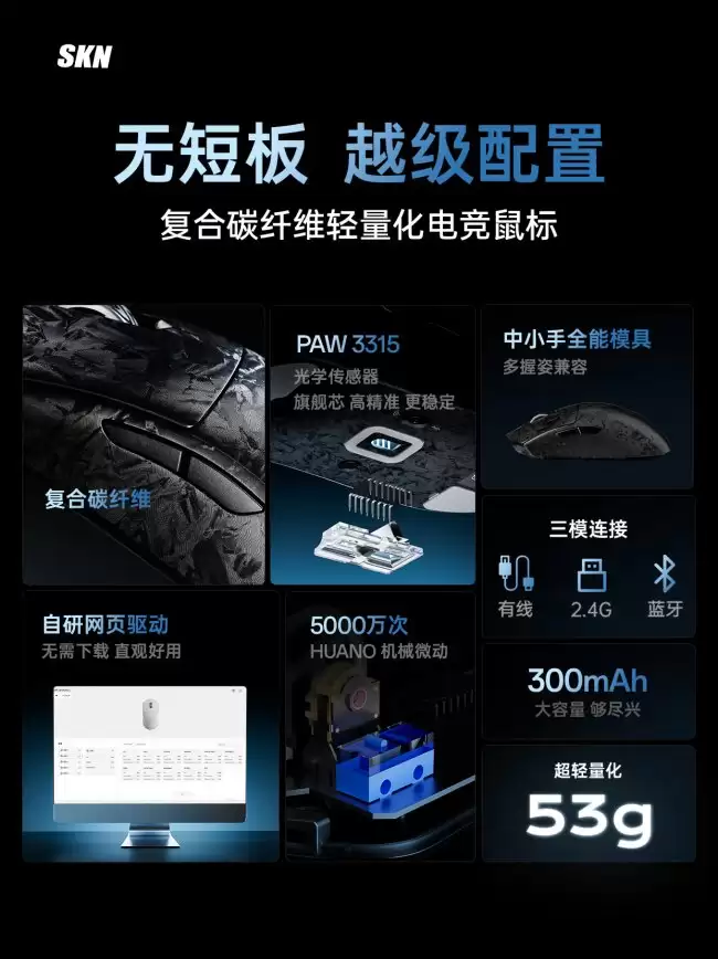 今晚八点,SKN朱雀-惊碳鼠标正式开启销售。其核心卖点在于极致的性价比与轻量化设计:首发价格锁定在99元,整体重量却仅为53克。鼠标外壳应用了激光雕刻工艺的复合碳纤维材料,为追求轻量化操控的中小型手玩家提供了一个高关注度的新选择。
