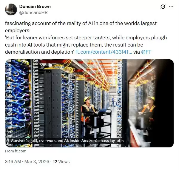 亚马逊计划年度支出超过1000亿美元,然而大部分都砸进了数据中心和AI芯片。人力专家邓肯·布朗在社交媒体上评价道:“一边压榨员工设定更高目标,一边把钱投给可能取代他们的工具,这简直是士气杀手。”