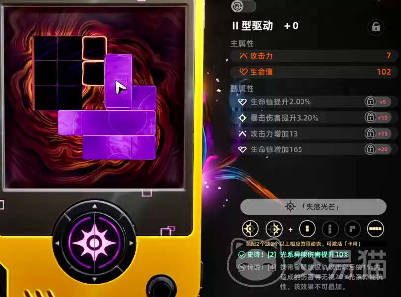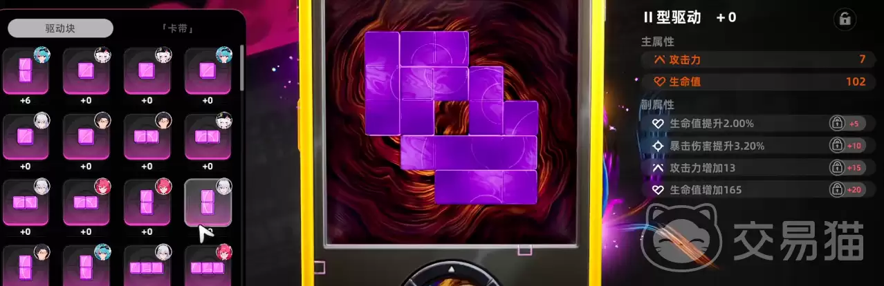 那么驱动块是做什么的呢?它本身不提供任何属性加成,它的唯一使命就是“激活”卡带内嵌的属性。不同卡带表面的纹样各不相同,这对应着所需驱动块的类型也不同。驱动块的玩法有点像俄罗斯方块,你需要按指定数量将其填充到卡带中,才能触发全部属性。好消息是,这个部件同样通过空慕副本稳定产出,不需要你再额外寻找其他获取渠道。