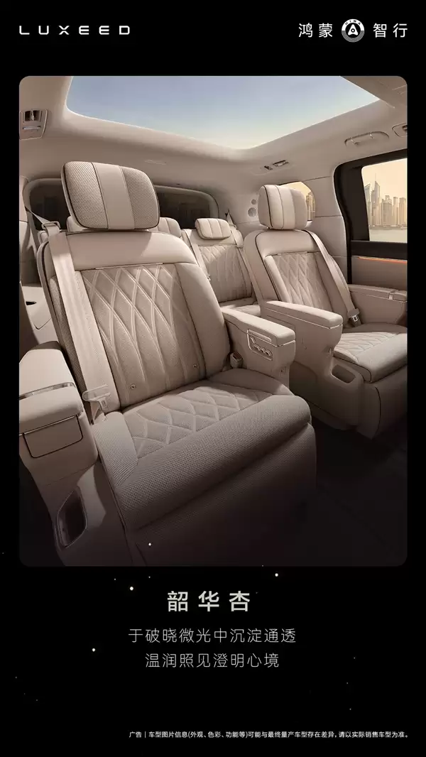 V9采用2+2+3的七座布局,设计重心聚焦于第二排。这两张独立座椅集成了多角度调节模式:45°迎宾姿态便于乘员进出,90°标准坐姿保障长途乘坐支撑,180°对坐模式则能快速将座舱转换为移动商务洽谈或家庭互动空间。这一功能逻辑清晰指向了高端商务出行与多成员家庭出行的复合需求。