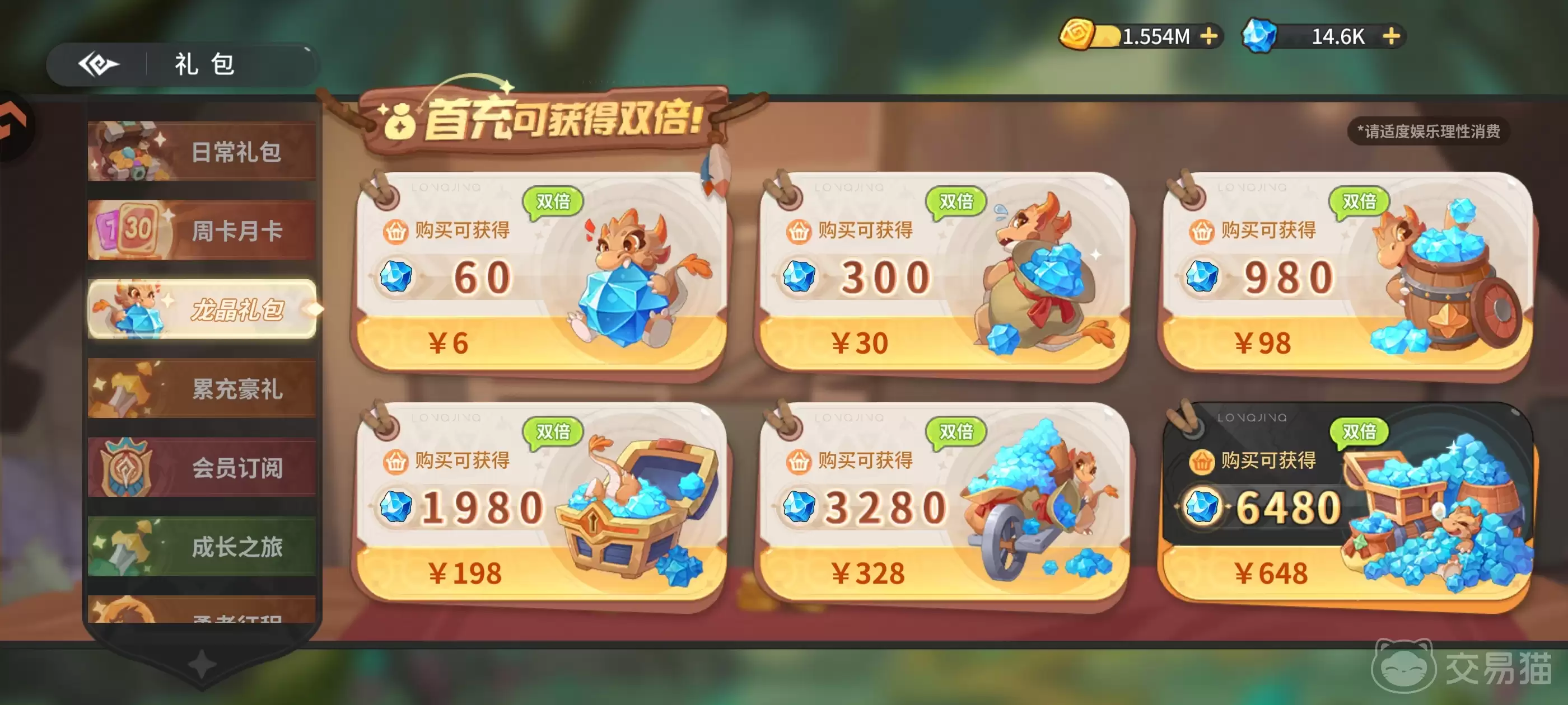 龙晶礼包:首次充值对应档位可享双倍龙晶返还,例如首充648元,实际到账12960龙晶。