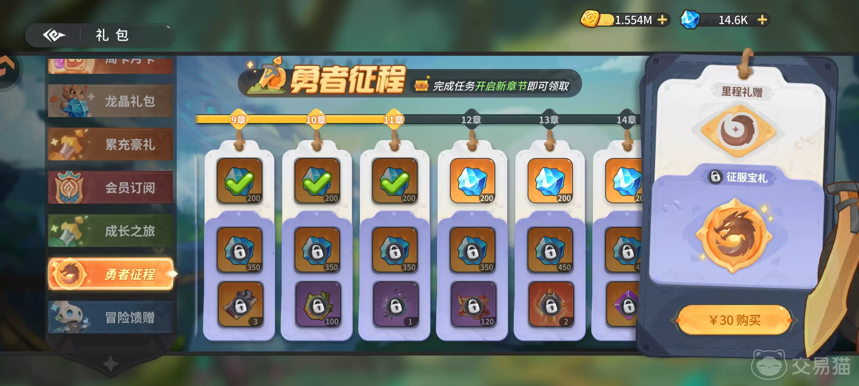 勇者征程:这是通关推图解锁的进阶战令手册,售价30元,可获得6000龙晶、330混沌之华、1枚史诗宠物蛋及多项角色养成资源。