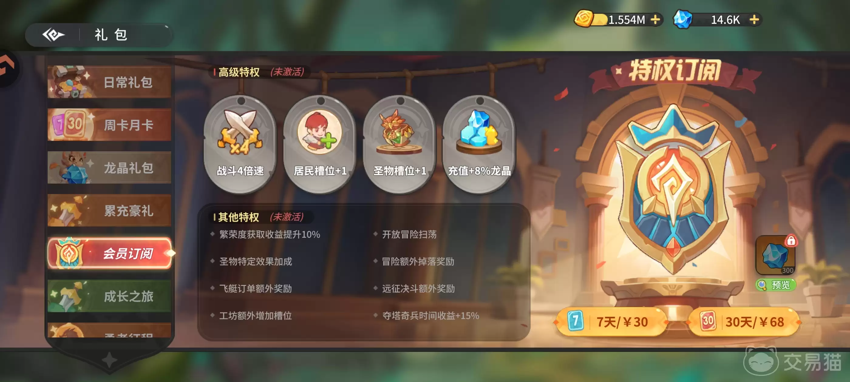 会员订购:激活后永久生效,提供战斗速度×4加成、额外1个居民槽位、1个圣物槽位,并使后续所有充值额外获赠8%龙晶。