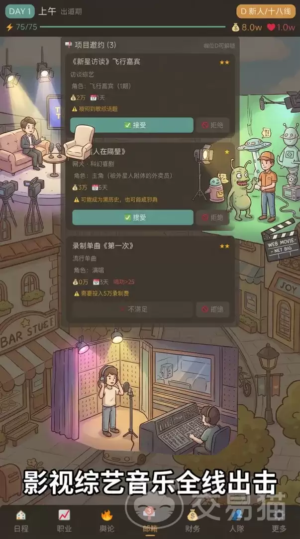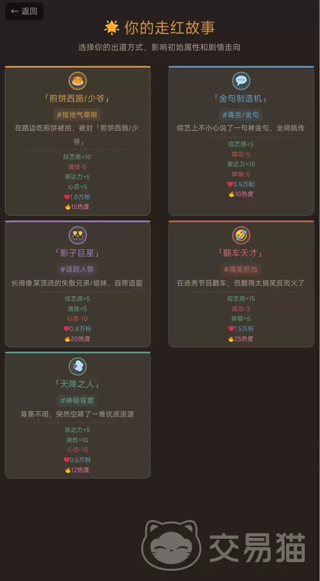 游戏开局第一道选择题就很有意思:你打算以何种方式出道?这里有五条截然不同的路径任君挑选——“煎饼西施/少爷”、“金句制造机”、“影子巨星”、“翻车天才”或是“天降之人”。可别小看这个选择,它直接决定了你角色的初始属性,更像是一颗种子,影响着后续所有剧情分支的走向。选哪条路,很大程度上就决定了你未来的玩法策略。