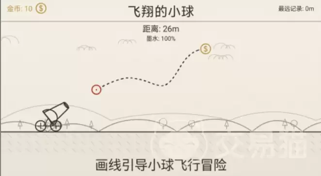 本作采用了极简主义的手绘美术风格,线条柔和,配色舒缓,界面没有任何冗余元素,视觉上自带一种天然的放松感。它的核心玩法围绕“大炮发射+轨迹引导”展开:玩家只需用手指在屏幕上绘制飞行路径,就能控制小球的运动方向与力度。目标很简单,就是让小球飞得更远,同时收集沿途的金币,逐步解锁新的场景、道具以及更多趣味机制。