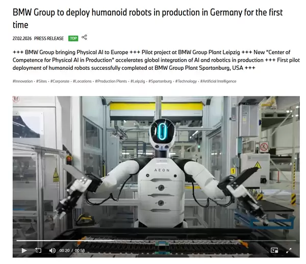宝马集团正将汽车生产自动化推向新高度。2月27日,集团确认将在德国莱比锡工厂整合先进的人形机器人系统。这标志着宝马首次在欧洲生产体系中引入具身智能解决方案,超越传统机械臂的应用范畴。