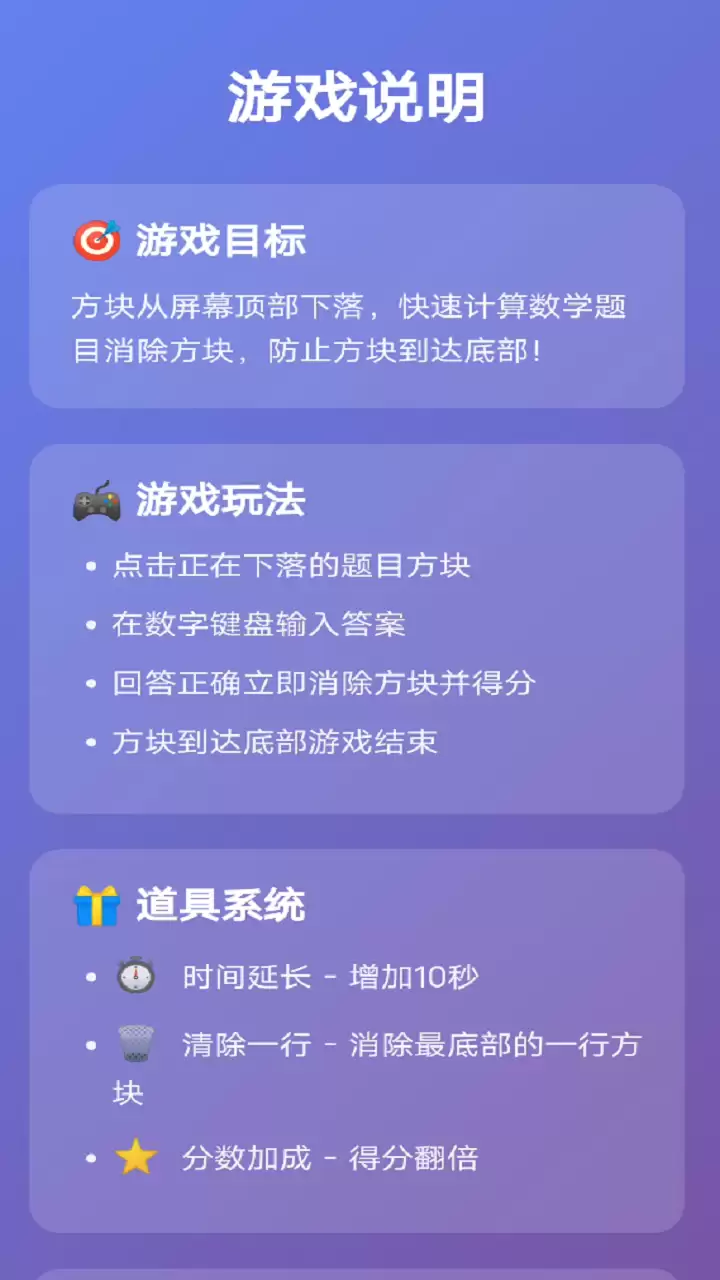 游戏的核心玩法清晰而富有挑战性:方块会从屏幕顶部匀速下落,你的任务则是快速解答方块上显示的数学题,输入正确答案来消除它们。一旦方块堆积到底部的危险区域,游戏便宣告结束。听起来简单,但紧张感十足。