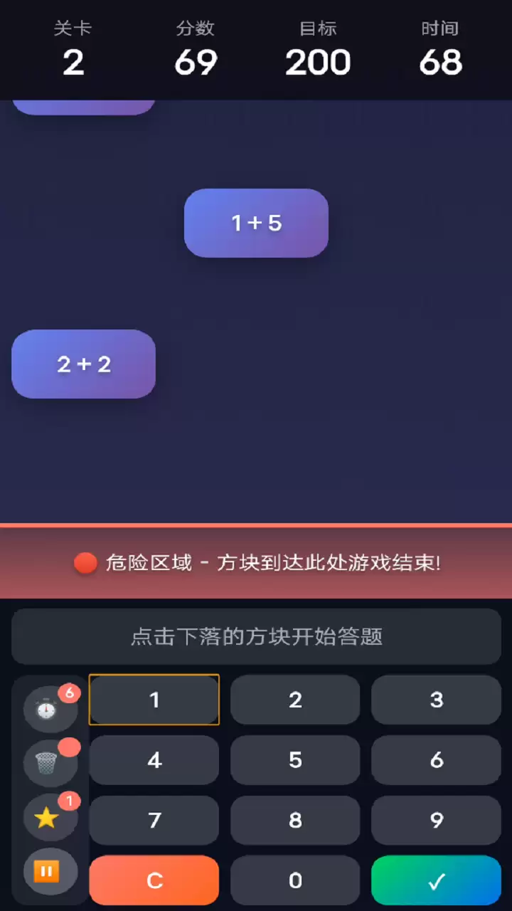 操作上极其直观:点击正在下落的题目方块,弹出数字键盘,输入答案。答对,方块瞬间消除,分数到手。这里有个小窍门:答题速度越快,获得的分数加成就越高,这可是冲击高分的关键。