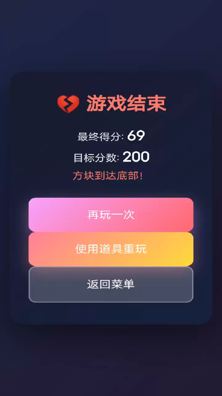 当然,遇到棘手时刻也不必慌张。游戏提供了三种实用道具助你一臂之力:“时间延长”能为你额外争取10秒;“清除一行”可以瞬间消掉最底部那排令人焦虑的方块;而“分数加成”则让你在一定时间内获得双倍得分。合理使用它们,往往是通关的制胜法宝。