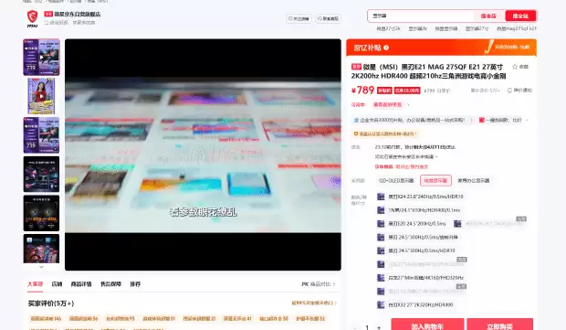 微星MAG 275QF E21黑刃显示器最大支持2560*1440分辨率,拥有210Hz刷新率与0.5ms GTG响应时间,屏幕尺寸为27英寸。显示器拥有121% sRGB色域覆盖,通过德国莱茵认证并采用DC控光技术,支持三年质保。
