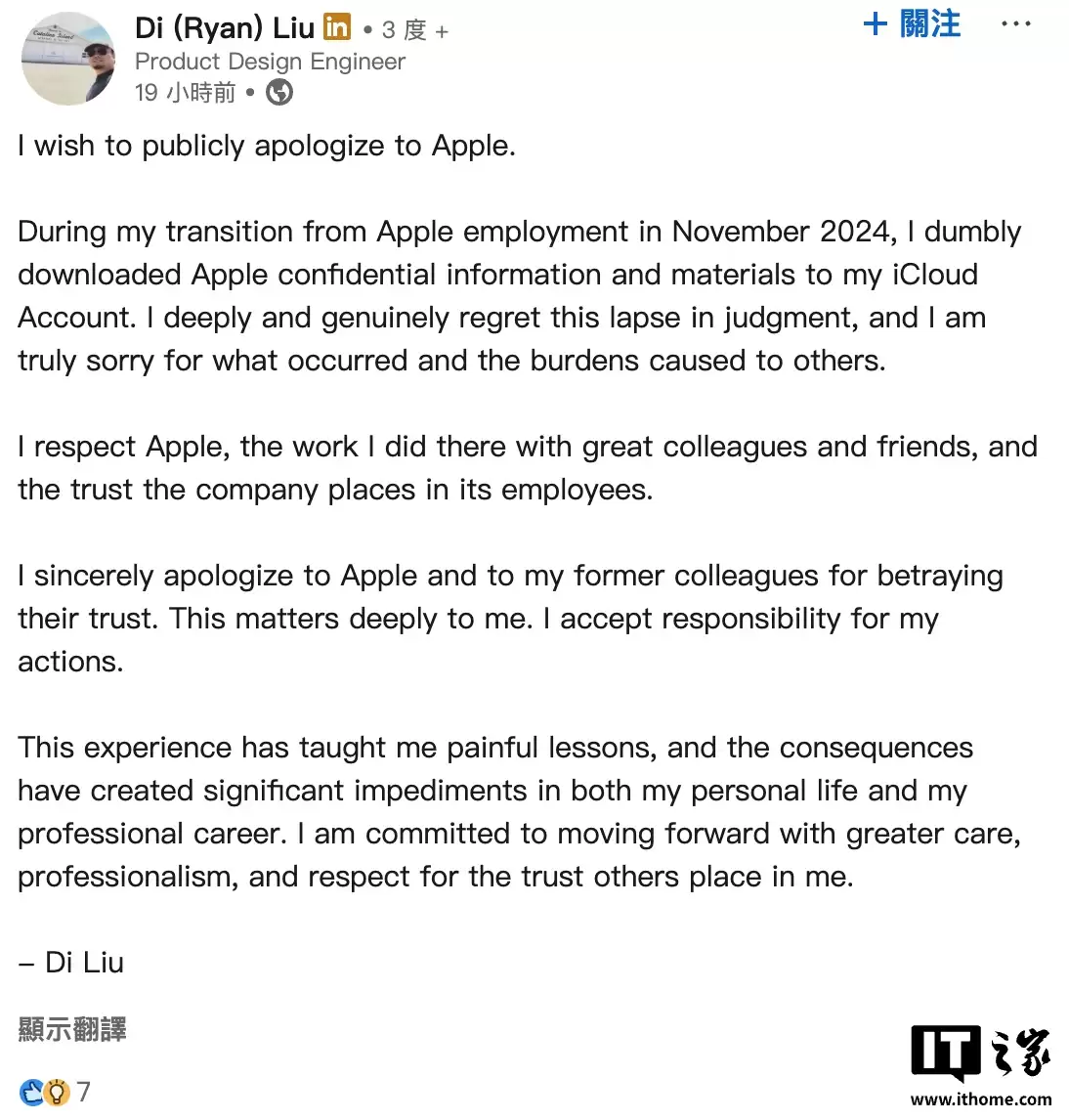 除了法律上的和解,Di Liu本人也在领英上发布了公开道歉。他承认自己“错误地下载了苹果公司内部机密资料”,并将这一行为归结为一次“判断失误”,表示愿意承担全部责任。