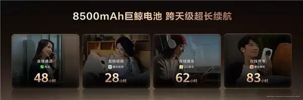 续航焦虑是现代人的通病,而畅享90 Pro Max所搭载的8500mAh华&为巨鲸电池,给出了强有力的回应。在多项严苛的续航测试中,其表现都优于同档位机型:连续通话时间可达48小时;使用腾讯视频追剧,续航长达28小时;用QQ音乐在线听歌,能畅听62小时;如果是通过番茄畅听播放音频,更是能持续播放83小时之久。这样的续航能力,足以让用户的影音娱乐享受彻底摆脱电量束缚。