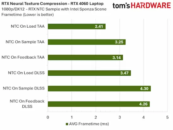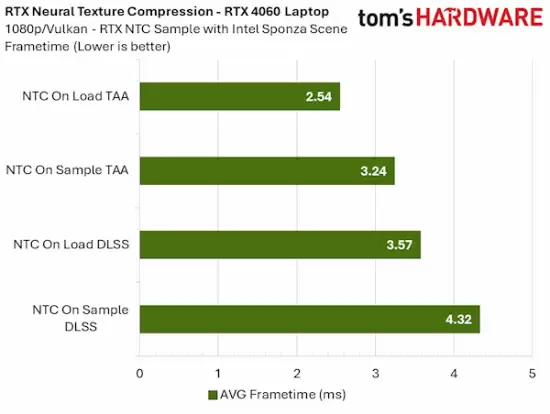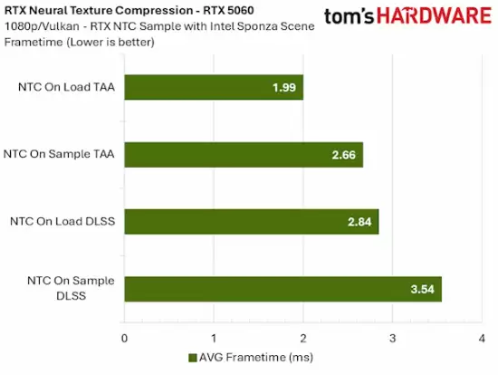 报告同时指出,本次测试场景仅包含基础的前向渲染与抗锯齿流程。实际3A游戏包含大量不受NTC影响的渲染通道(如阴影映射、复杂光照等),因此该技术在真实游戏环境中的相对性能损耗,将比实验室数据更低。