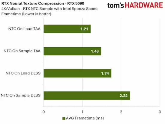 旗舰级RTX 5090在4K分辨率下,启用采样时推理模式并配合TAA抗锯齿,其单帧渲染时间仅比零开销的加载时推理模式增加了0.09ms。这种量级的性能损耗,在实际游戏体验中几乎无法察觉。