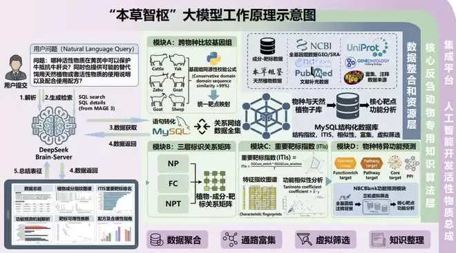 基础图谱绘就后,更深层的挑战在于数据整合与知识挖掘。为解决领域内数据孤岛与关联分析难题,团队创建了核心基础设施——中国饲用天然植物活性物质数据库(NBCBank)。该数据库采用“植物-成分-靶标-功能-效能”五位一体的架构,系统整合了154种植物、超8000种活性成分、8525个分子靶标及5800余万条关联数据。其中,超过80%的反刍动物专用分子互作数据为全球首次规模化、标准化收录,突破了该细分领域的数据瓶颈。