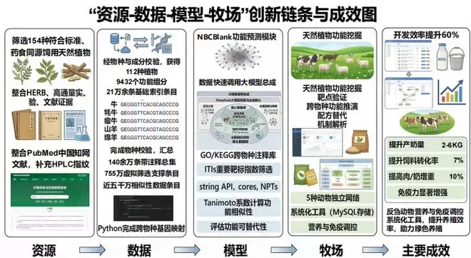 项目始于一项基础性资源普查。研究团队系统分析了全国154种饲用天然植物的活性物质,首次构建了全国饲用植物资源的空间数字化图谱。该图谱明确了“两核-一带-三区”的分布格局,并量化了关键活性成分的地域丰度差异。这为后续实现原料的精准溯源、标准化评估与高效开发,提供了关键的数据底板和决策支持。