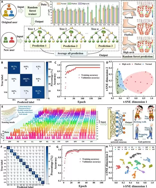 硬件采集的足底压力数据仅是原始信息,其核心价值在于临床解读。鞋垫通过16通道无线模块实时传输数据,而内嵌的人工智能算法则扮演了“智能诊断官”的角色。经充分训练,系统对足弓异常识别的准确率达96%,对包括帕金森病慌张步态、脑卒中后偏瘫步态等在内的12种病理步态,综合分类准确率高达97.6%。