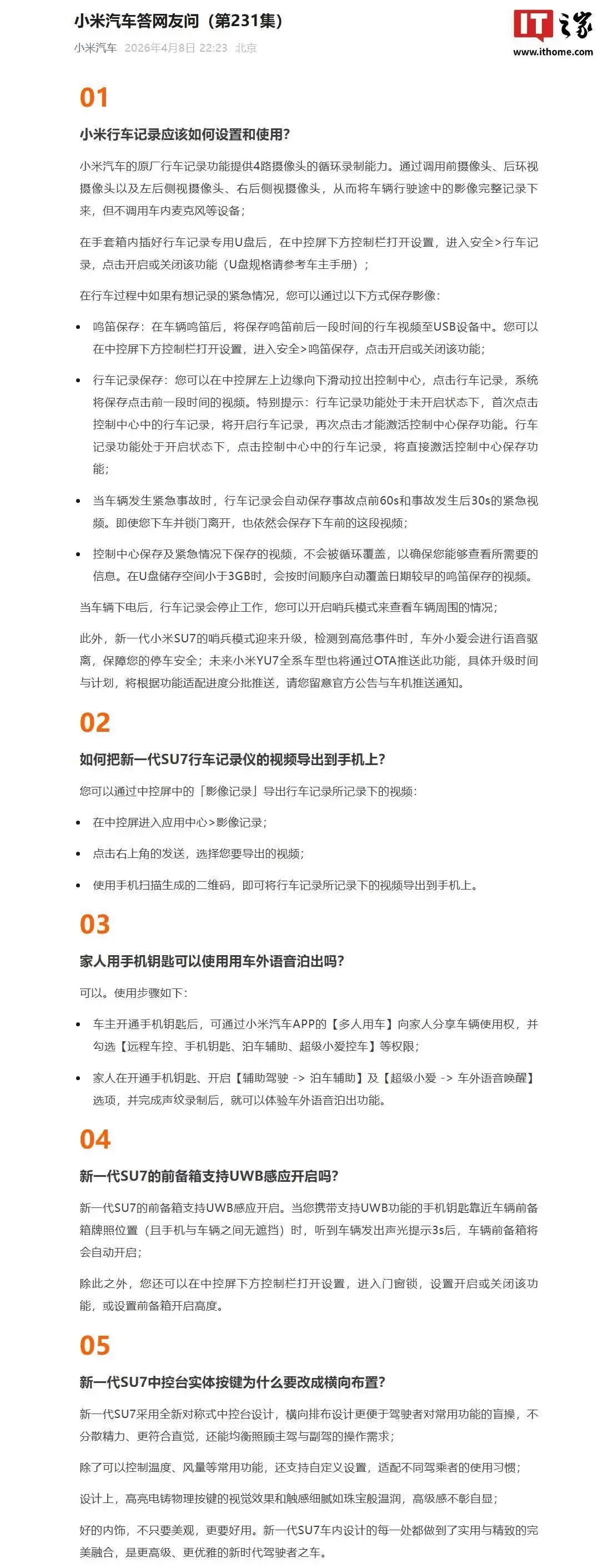 小米汽车官方最新发布的“答网友问”聚焦于用户高频咨询的操作细节。本期内容深度解析了行车记录仪设置、视频导出流程及多项车辆功能的具体应用,为车主提供了一份可直接上手的实用操作手册。