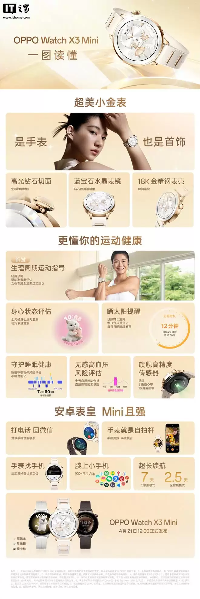 各位智能穿戴爱好者请注意,一款定位独特的新品即将登场。OPPO Watch X3 Mini 智能手表已定档 4 月 21 日 19:00 全球首发。这款产品打出了“超美小金表”的称号,其宣传语“是手表也是首饰”也直接点明了它兼顾科技美学与时尚配饰的双重属性。从目前已释放的信息看,它在女性健康管理与轻量化独立体验上,下了不少功夫。