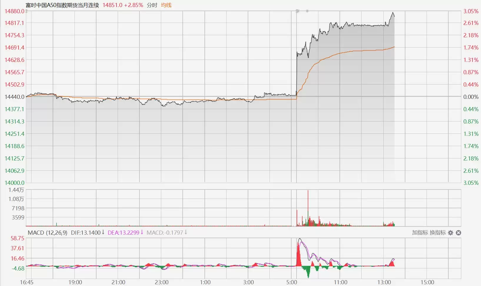市场情绪在今日早盘得到集中释放。富时中国A50指数期货开盘后快速走强,涨幅迅速扩大至3%以上,主力合约价格触及14880点关口。