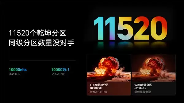 画质基石的另一关键是背光分区。A10H Pro最高支持11520个乾坤分区,实现了接近像素级的精细控光,极大抑制了光晕干扰。呈现效果是:黑色深邃纯净,色彩饱满鲜活,明暗细节层次丰富,动态对比度极具张力。正是这套精密的光学系统,支撑起了其10000尼特的超高峰值亮度。