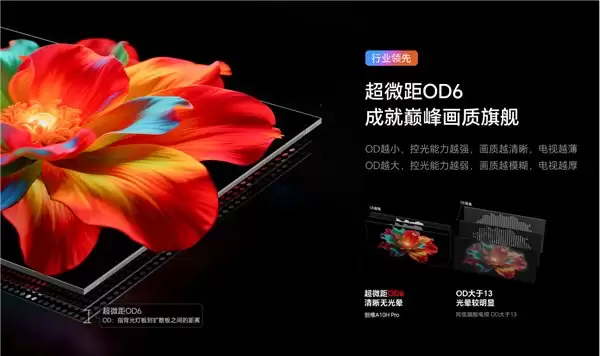 画质突破的起点在于OD(Optical Distance)技术。OD值代表背光灯珠到扩散板的距离,数值越小,光线控制越精准,画质潜力越大。创维A10H Pro行业首发的超微距OD 6技术,将这一距离缩减至6毫米。其直接优势是:屏幕峰值亮度大幅提升,光晕现象得到有效控制,物体边缘清晰锐利,画面干净利落。