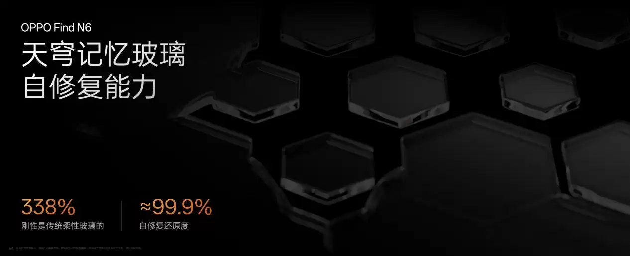 在平整铰链的支撑之上,屏幕玻璃自身的性能同样关键。下一代折叠屏玻璃需兼具“柔韧”与“刚性”。Find N6 搭载的全新天穹记忆玻璃,其刚性达到传统柔性玻璃的3倍以上。核心在于其“形状记忆”能力:弯折展开后,玻璃可实现高达99.9%的自修复还原率。类比记忆材质,受压后能缓慢恢复原状。这种自我修复特性不仅响应迅速,而且耐久性卓越——即使经过60万次反复折叠,其回复性能依然稳定,成为屏幕长期保持平整的核心保障。