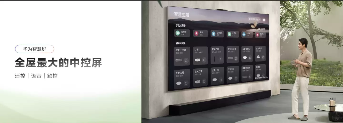 随着全屋智能时代的到来,客厅大屏的角色正在发生根本性转变。华为智慧屏 MateTV 凭借灵犀指向遥控、鸿蒙AI等多种创新交互方式,化身为家庭中最大的中控屏,让用户可以通过语音、遥控、触控轻松操控全屋智能设备。全屋设备状态一目了然,无需切换多个APP,语音或触屏就能一键调控——回家自动开启舒适模式,睡前一键启动睡眠模式,智能家居操控变得简单直观,全家老小都能轻松上手。