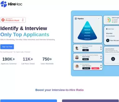 总而言之,Hire Hoc是一款功能集成度高、上手门槛低的智能招聘工具。它通过将自动化与智能化植入招聘的关键环节,切实帮助用户提升效率、控制成本。从定制职位描述到高效的AI初筛,其设计直击招聘工作的痛点。