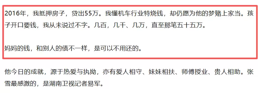 对于白手起家的女性,房产是终极的安全保障。然而,为了儿子的梦想,她押上了这一切,并明确表示无需偿还。张雪妻子的账单记录证实,2016年确实收到了来自何琼的60万元汇款。