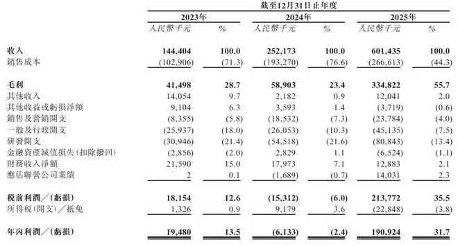 财务增长曲线陡峭。招股书披露,2024年、2024年及2025年,公司营收分别为1.44亿元、2.52亿元和6亿元,实现跨越式增长。2025年毛利达3.35亿元,毛利率提升至55.7%,标志着其盈利能力的结构性优化。