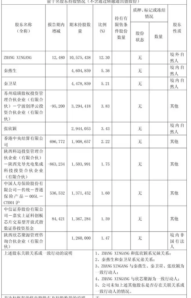 关键的一致行动关系如下:ZHANG XINGANG与张欣颖为兄妹关系;秦燕生与秦卫星为兄弟关系。此外,ZHANG XINGANG博士与秦燕生、秦卫星、张欣颖及陕西欣芯聚源管理咨询合伙企业构成一致行动人。通过该安排,ZHANG XINGANG博士合计控制公司约27.76%的投票权,为实际控制人。