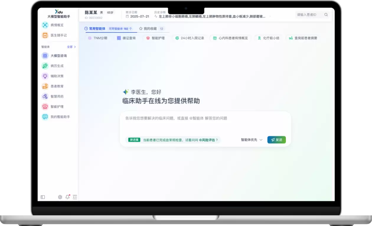 这些智能体均源于真实临床场景的深度打磨:医渡科技已在合作医院的真实环境中沉淀了超过200个专科智能体,它们经过领域专属数据训练并完成临床验证。这种专科“顾问团”的协同模式,有效解决了通用AI“泛而不精”的痛点,为医生提供更贴合实际诊疗逻辑的决策支持。