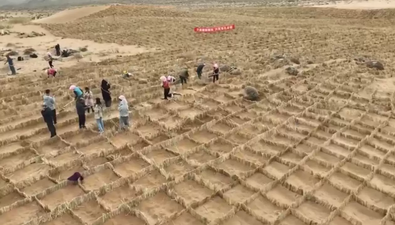 在沙漠里建电站,首先要攻克的就是流沙这道难题。项目团队采用了一套“草方格固沙先行,植被种植跟进”的组合拳:先用一米见方的麦草方格锁住流动的沙丘,遏制沙粒的迁移;待沙丘稳定后,再播撒草籽、栽种耐旱灌木,逐步构建起植物的覆盖层。在基地一期项目中,这2.8万亩草方格不仅发挥了固沙的即时功效,其逐渐腐化后,还能增加土壤的有机质,为后续植被的生长提供宝贵的养分。