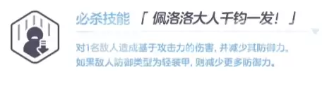 至于终极技能「佩洛洛大人干钧一发!」,这是一个单体攻击技能,在造成伤害的同时还能降低目标的防御力,对轻装甲单位的减防效果更为突出。虽然技能本身的爆发伤害不算顶尖,但其战略价值在于能有效软化敌方关键单位,为后排的主力输出角色创造更高效的打击窗口,整体改善队伍的DPS环境。