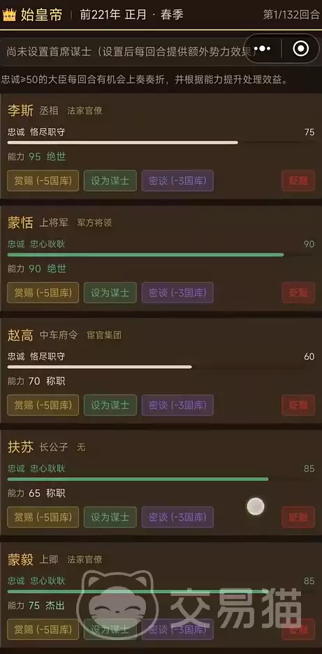 人事任命可不是简单的拖拽操作。游戏里的人物品格是动态的,每个人都有详细的资质模型。比如李斯,内政能力高达92,精通律法;蒙恬则武略超群,尤其擅长边防。而像赵高这类人物,行政效率不低,但野心值也高得吓人,一旦他的权柄指数超过某个阈值,著名的“指鹿为马”事件链就可能被触发。任命官员时,必须仔细考量岗位的核心要求:丞相需要极高的内政能力和足够的忠诚度;上将军则要求顶尖的武略和统率力;至于监军,忠诚与洞察力缺一不可。