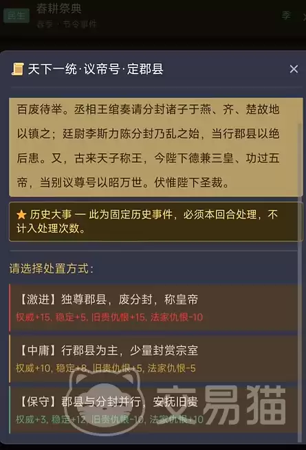 游戏的叙事由一套强大的历史事件引擎驱动。整个游戏里埋藏了137个强关联的事件节点,比如“荆轲献图”时你只有1.8秒的反应时间;下达“焚书令”会大幅提升法家支持度,但也会得罪天下儒生;而“南征百越”的战略抉择,成功则开疆拓土,失败则可能导致岭南叛乱。每一个事件的选择,都会像蝴蝶效应一样,影响未来十年的帝国格局——如果在统一初期拒绝修建驰道,那么后期郡县对中央政令的响应速度会变得极其迟缓,严重削弱统治效率。