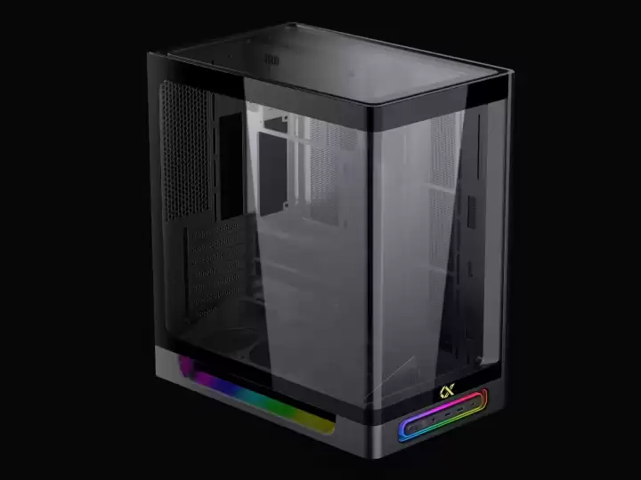 外观设计上,Hea ven机箱最大亮点在于其双侧及顶部均采用了无立柱的曲面钢化玻璃,共同构成了一个270度的全景视野。侧板的开口设计经过特别优化,能够完整地展现出安装在底部的ARGB灯效系统,消除了视觉死角。前置I/O面板的配置也相当务实,提供了2个USB-A接口和1个USB-C接口,满足多设备连接需求。而面板外围环绕的“无限镜”灯环,则巧妙地将功能性接口与视觉装饰融为一体,实现了交互体验与感官享受的同步进阶。