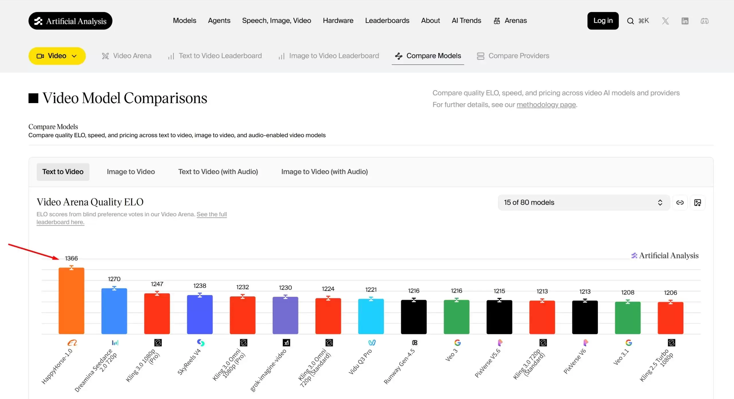 访问Artificial Analysis盲测平台: 最直接的体验方式是打开Artificial Analysis官网,进入其Video Arena视频模型盲测区。该平台采用ELO竞技机制,匿名展示不同模型的生成结果,HappyHorse-1.0也参与其中。