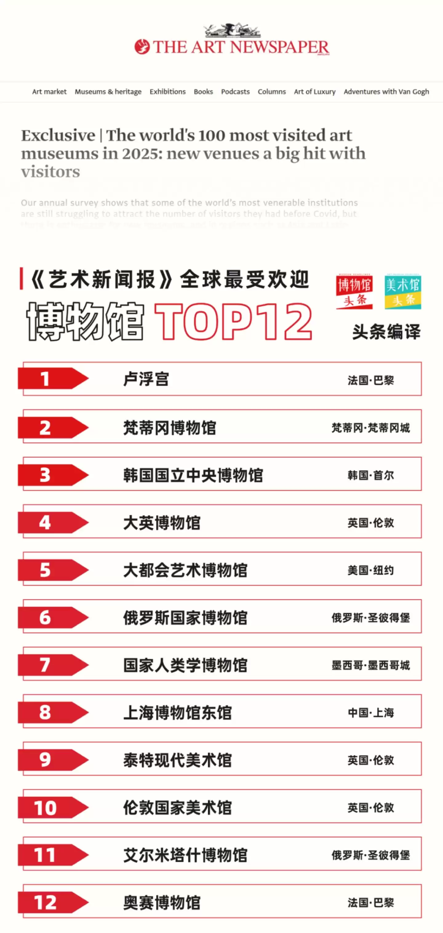 放眼全球,“博物馆游”本就是文化旅游中不可或缺的一环。2025年全球博物馆参观研究年度调查报告显示,全球顶级博物馆、美术馆年总访客量超过2亿。其中,卢浮宫、梵蒂冈博物馆、韩国国立中央博物馆位居前三。而在最受欢迎的Top12博物馆中,国内仅上海博物馆东馆占据一席。