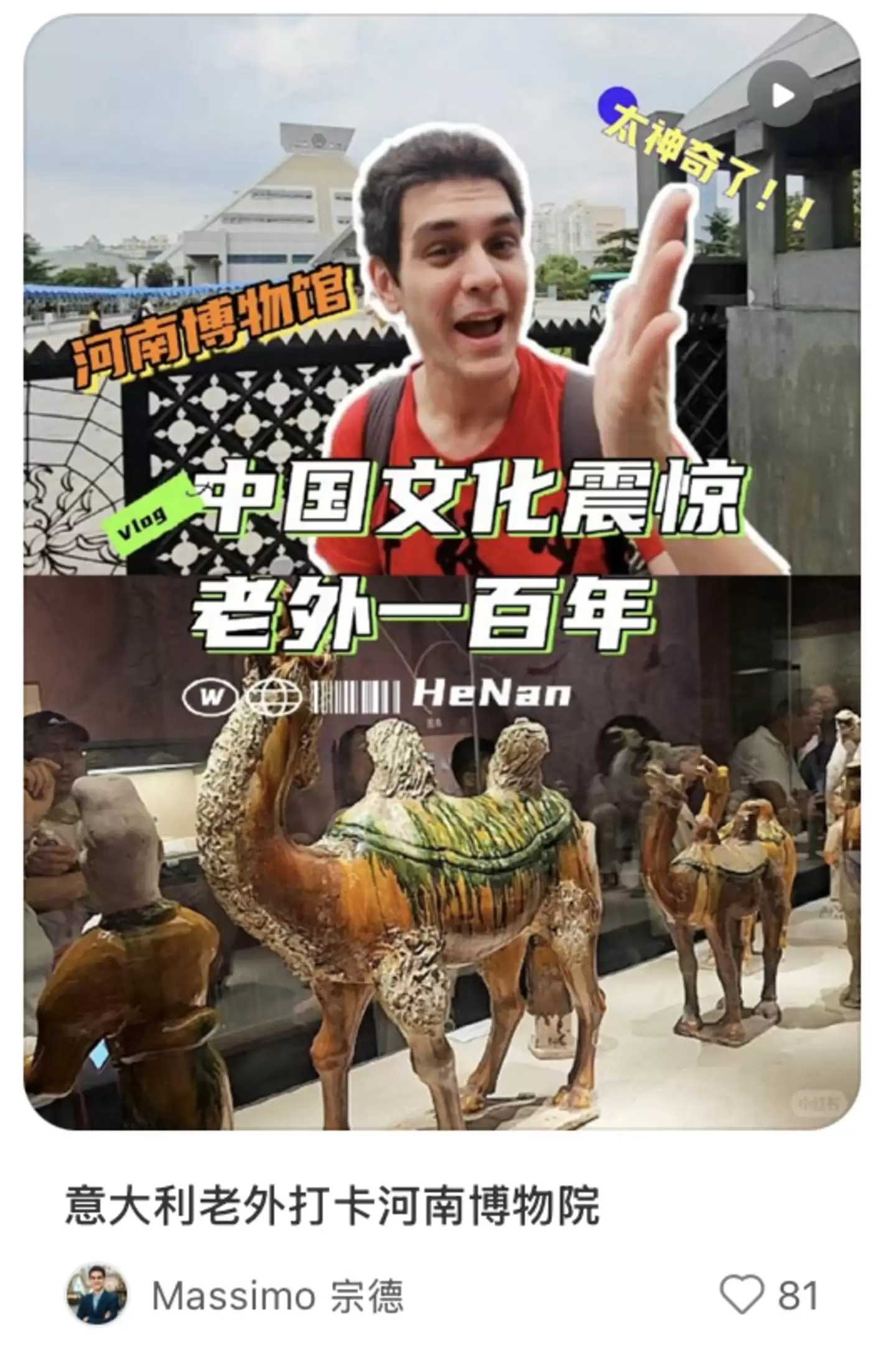 无独有偶,社交媒体上,一位名叫“Massimo宗德”的意大利博主逛河南博物院的视频也火了。视频封面打着“中国文化震惊老外一百年”,内容则是他一路的惊叹。
